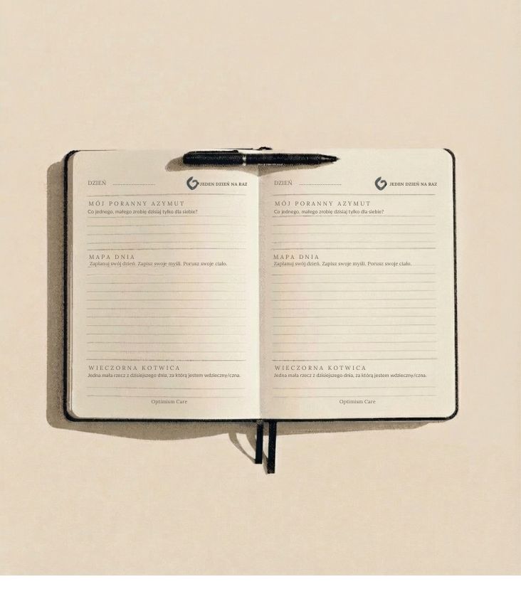 Mapa Dnia: Przelej myśli na papier. To bezpieczna przestrzeń, w której możesz bez oceniania zapisać wszystko, co czujesz. Nazywanie emocji to pierwszy krok do ich oswojenia.